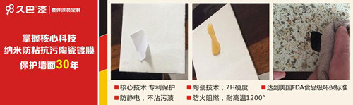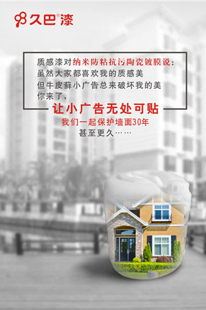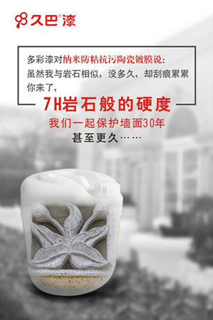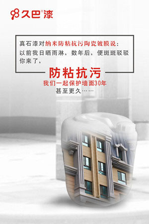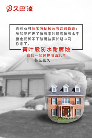 久巴漆的獨門武器不僅能解決平面型還是荔枝面型的仿石漆的抗污問題,還能解決外墻沉積污染和侵入污染的問題。仿石漆+久巴納米防粘抗污陶瓷鍍膜涂料,等于為仿石漆加上一層防污染的保護外衣,抗污自潔,不易沾惹灰塵,通過雨水沖刷,外墻即可靚麗如初,其且保護墻面30年。