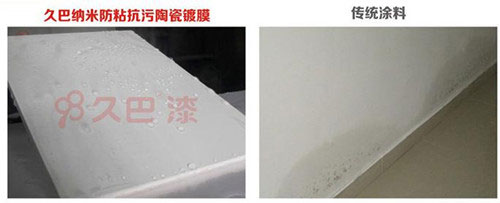 納米無機涂層結構表面張力很大(指數高達130+σ),超高的表面張力賦予涂層荷葉般的防水自潔,就是不沾水、不沾油,比如荷葉,比如鴨身上的羽毛過水后水會成為水珠形狀流過,而不會像棉質物質直接被水打濕,在久巴納米防粘抗污鍍膜涂料圖層上,水會變成水珠形狀流出表面。