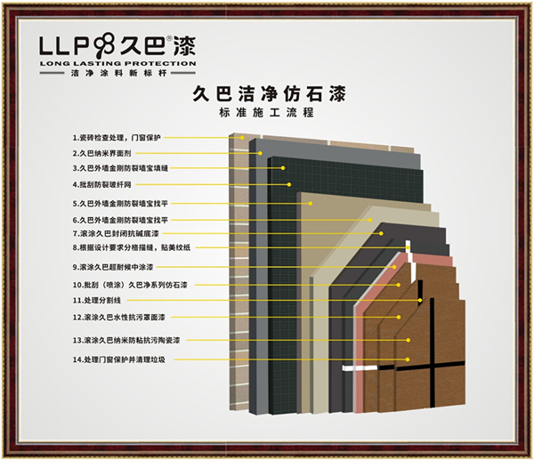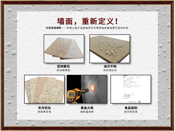 多年以來,久巴始終堅持“頂級科技,創造奇跡”的宗旨,從未停下過科研的步伐,最終在仿石漆市場低迷的時候實現逆風飛翔,推出的“凈”系列仿石漆產品備受業主推崇,顛覆傳統仿石漆效果,裝飾效果突出,功能強大,具備超強自潔力,能夠抗擊污漬、不怕涂鴉,改變了傳統仿石漆在面對水漬、污跡時候的劣勢,處于行業的領先高科技產品,在提供具有競爭力產品的同時,通過合理化的設計、科學的施工方案,確保外墻效果保持更長久,給仿石漆行業開創了新的局面!