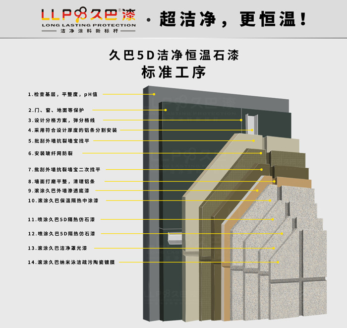 久巴5D潔凈恒溫石漆歷盡長期的研發、測試、調整配方、開發出來的一款,具備保溫隔熱、反射隔熱、陶瓷長效抗污、陶瓷耐高溫、耐紫外線等的性能強大的仿石漆。