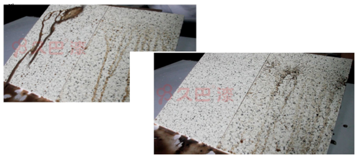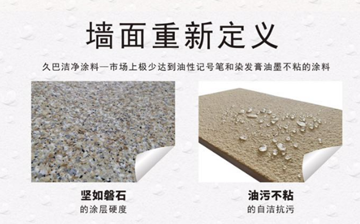 久巴5D潔凈仿石漆表面雖是凹凸感狀態,但因為乳液將彩砂完整包裹,并彩砂間有效成膜,疏水、疏油,墻面不易沾污漬。灰塵僅是浮在表面,下雨后,會將會沖洗干凈。而其它仿石漆,表面凹凸感強,同時因為乳液含量少,彩砂間沒有有效成膜,灰塵會滲入涂層內部,不易清。