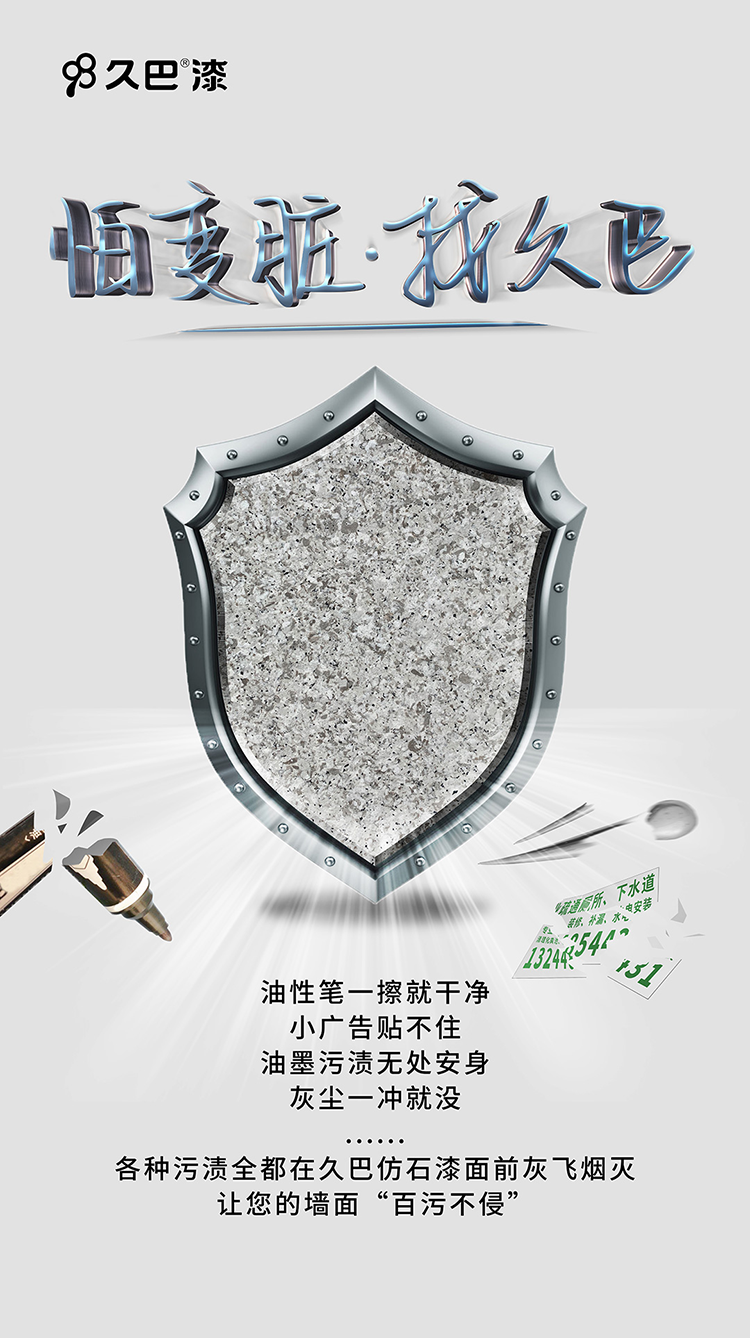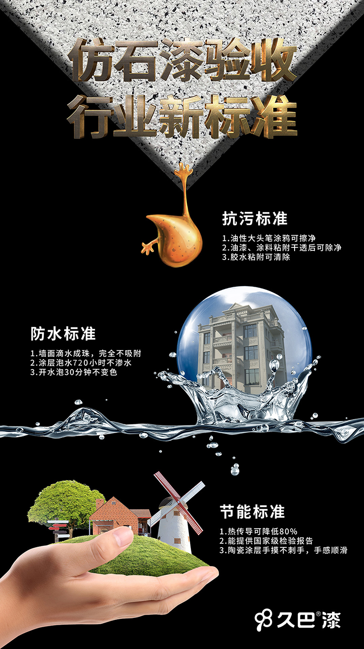 久巴是一家專業研發制造高端仿石漆的國家高新技術企業,主要研發、生產、制造高端仿石漆,是第一個采用金屬陶瓷產品來制作的外墻涂料的涂料企業,同時也是國內最大的金屬陶瓷涂料的生產制造商,生產高端工業不粘涂料,主要客戶有美的電器,蘇泊爾,格力等等家電企業,大多數的不粘鍋和電飯煲涂層都是采用久巴的金屬陶瓷不粘涂層。從2015年開始,創新性的將金屬陶瓷不粘涂層應用于內外墻,和傳統丙烯酸類型涂料最大的區別是,涂層抗老化提升10倍以上,涂層不粘任何污漬,油性記號筆涂鴉后一擦就干凈。涂層超級防水,泡水兩個月時間,涂層還是不滲水,所以解決了傳統涂料容易變臟,發黑,起皮,褪色的問題。